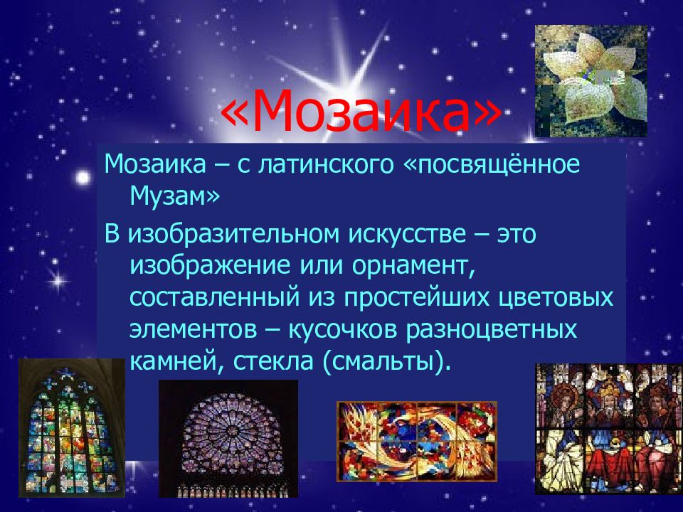 Мозаика – с латинского «посвящённое Музам» В изобразительном искусстве – это изображение или орнамент, составленный из простейших цветовых элементов – кусочков разноцветных камней, стекла (смальты).