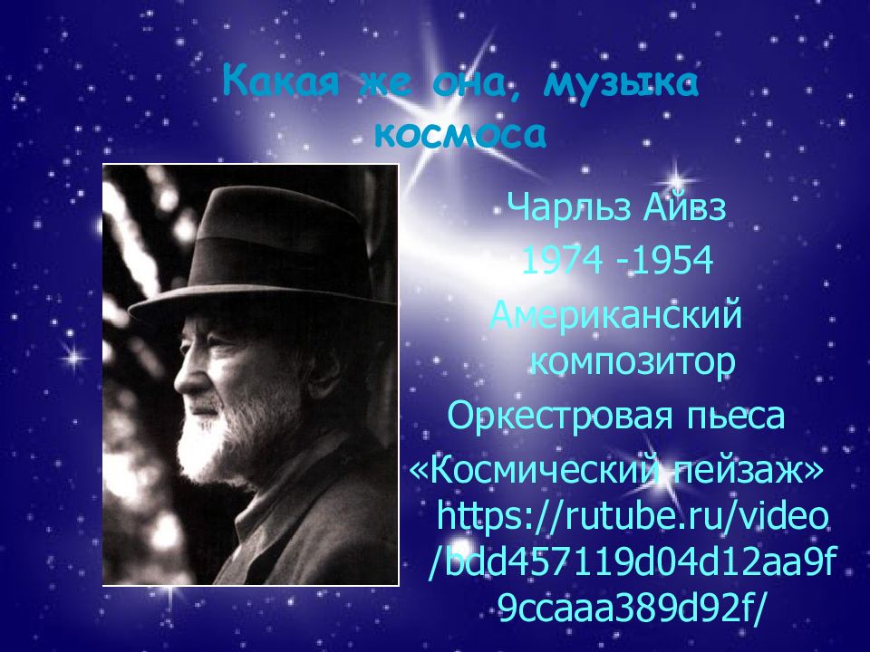 Чарльз Айвз 1974 -1954 Американский композитор Оркестровая пьеса «Космический пейзаж» https://rutube.ru/video/bdd457119d04d12aa9f9ccaaa389d92f/