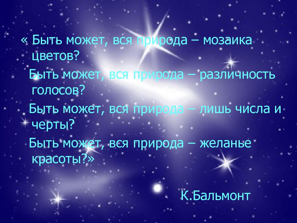 « Быть может, вся природа – мозаика цветов? Быть может, вся природа – различность голосов? Быть может, вся природа – лишь числа и черты? Быть может, вся природа – желанье красоты?» К.Бальмонт