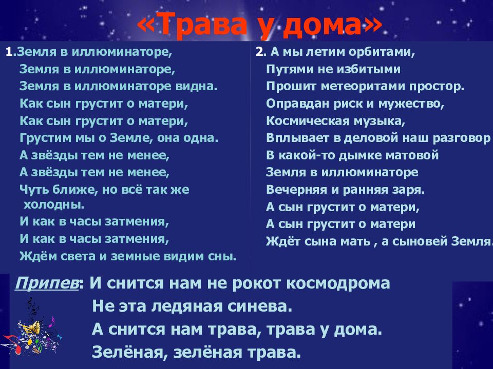 1.Земля в иллюминаторе, Земля в иллюминаторе, Земля в иллюминаторе видна. Как сын грустит о матери, Как сын грустит о матери, Грустим мы о Земле, она одна. А звёзды тем не менее, А звёзды тем не менее, Чуть ближе, но всё так же холодны. И как в часы затмения, И как в часы затмения, Ждём света и земные видим сны. 2. А мы летим орбитами, Путями не избитыми Прошит метеоритами простор. Оправдан риск и мужество, Космическая музыка, Вплывает в деловой наш разговор В какой-то дымке матовой Земля в иллюминаторе Вечерняя и ранняя заря. А сын грустит о матери, А сын грустит о матери Ждёт сына мать, а сыновей Земля. Припев : И снится нам не рокот космодрома Не эта ледяная синева. А снится нам трава, трава у дома. Зелёная, зелёная трава.