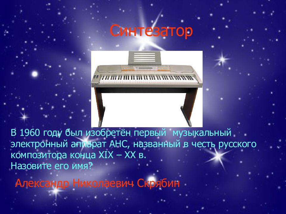 Александр Николаевич Скрябин В 1960 году был изобретён первый музыкальный электронный аппарат АНС, названный в честь русского композитора конца Х I Х – ХХ в. Назовите его имя?