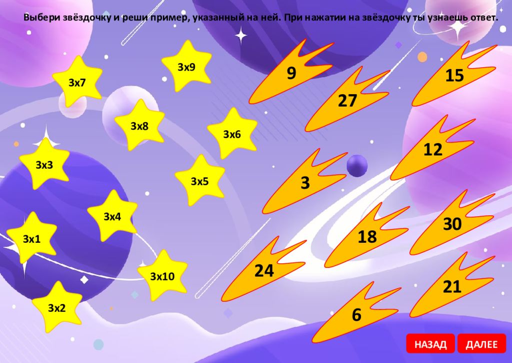 6 3 9 15 12 18 21 30 24 27 3x3 3x7 3x1 3x4 3x8 3x5 3x10 3x9 3x2 Выбери звёздочку и реши пример, указанный на ней. При нажатии на звёздочку ты узнаешь ответ. ДАЛЕЕ НАЗАД 3x 6