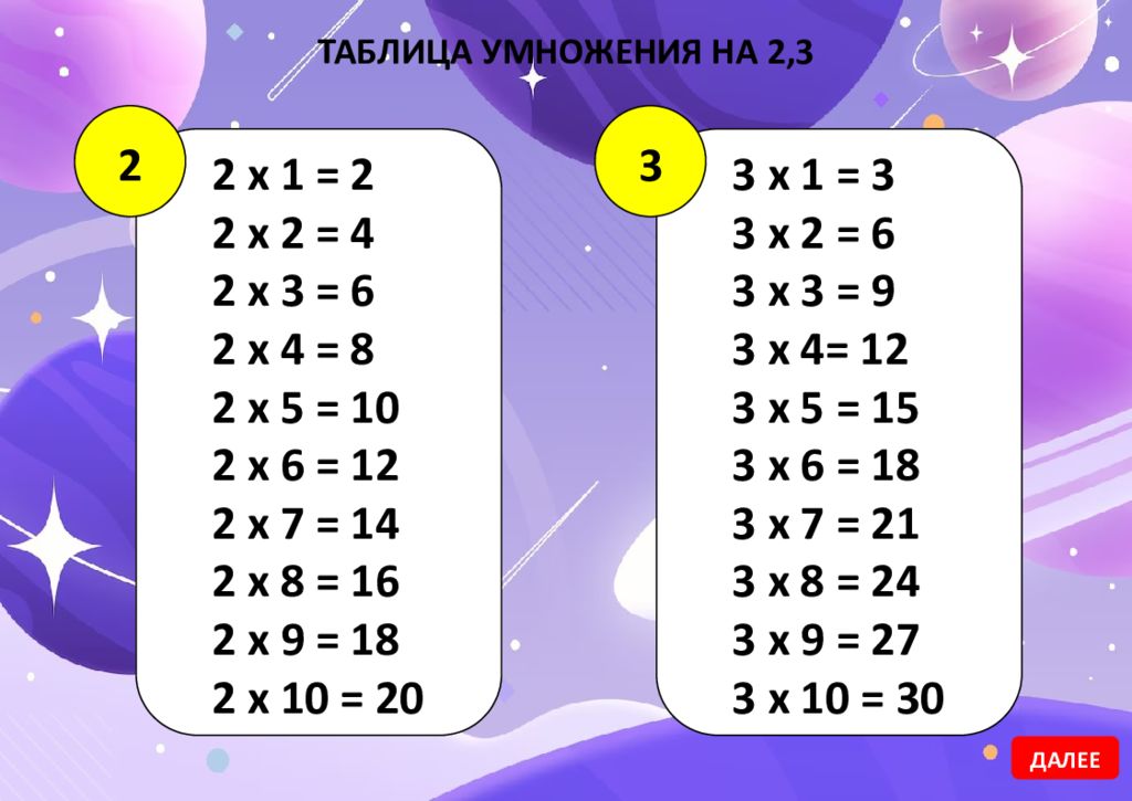 2 x 1 = 2 2 x 2 = 4 2 x 3 = 6 2 x 4 = 8 2 x 5 = 10 2 x 6 = 12 2 x 7 = 14 2 x 8 = 16 2 x 9 = 18 2 x 10 = 2 0 2 3 x 1 = 3 3 x 2 = 6 3 x 3 = 9 3 x 4= 12 3 x 5 = 15 3 x 6 = 18 3 x 7 = 21 3 x 8 = 24 3 x 9 = 27 3 x 10 = 30 3 ТАБЛИЦА УМНОЖЕНИЯ НА 2,3 ДАЛЕЕ