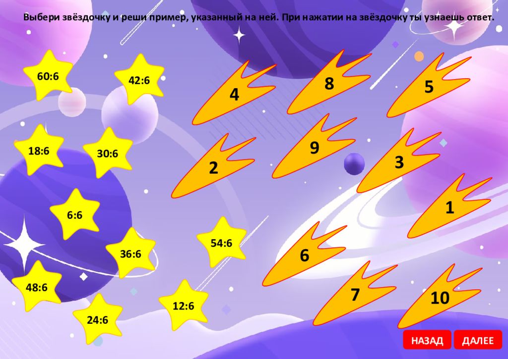 10 1 9 8 6 5 7 4 2 3 60:6 18:6 6:6 54:6 42:6 30:6 36:6 12:6 48:6 Выбери звёздочку и реши пример, указанный на ней. При нажатии на звёздочку ты узнаешь ответ. 24:6 ДАЛЕЕ НАЗАД
