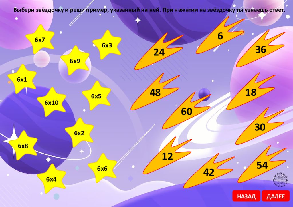 42 48 6 18 36 12 54 30 60 24 6х10 6х7 6х4 6х1 6х9 6х5 6х6 6х3 6х2 Выбери звёздочку и реши пример, указанный на ней. При нажатии на звёздочку ты узнаешь ответ. 6х8 ДАЛЕЕ НАЗАД
