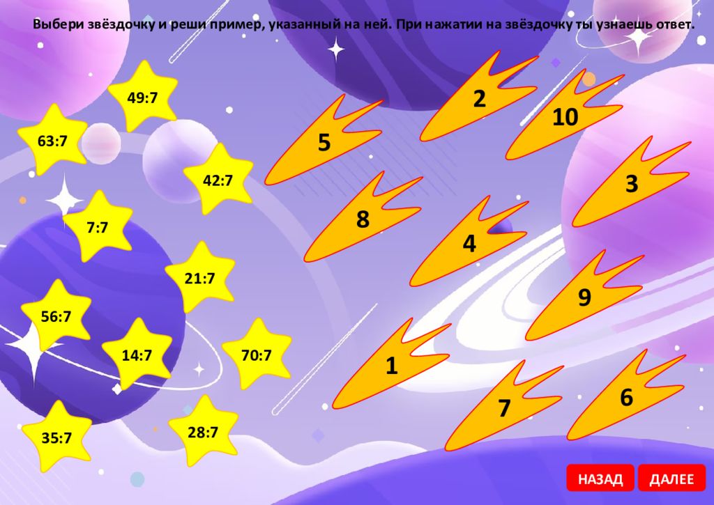 10 1 9 8 6 5 7 4 2 3 63:7 7:7 56:7 21:7 49:7 42:7 70:7 28:7 14:7 Выбери звёздочку и реши пример, указанный на ней. При нажатии на звёздочку ты узнаешь ответ. 35:7 ДАЛЕЕ НАЗАД
