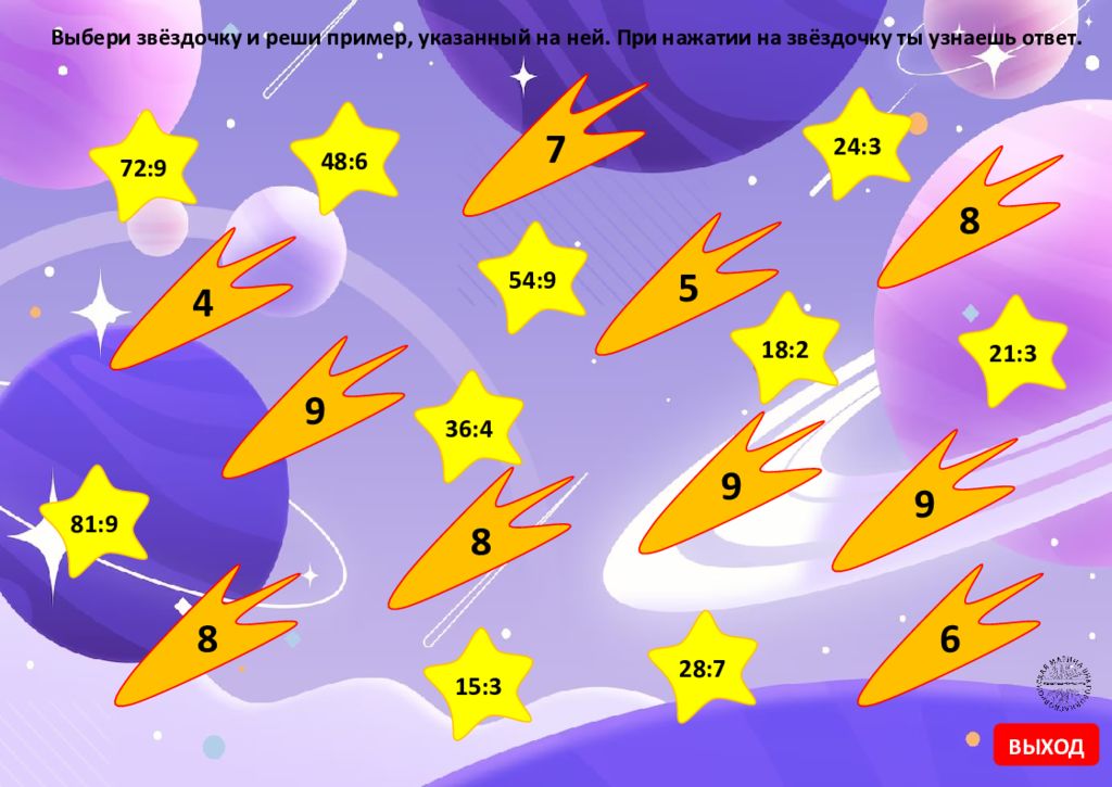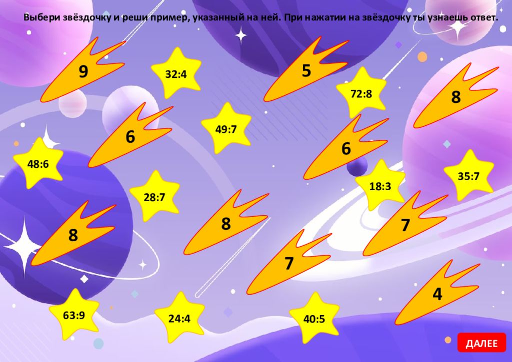 8 6 8 8 7 9 6 4 7 5 72:8 48:6 35:7 24:4 32:4 49:7 18:3 40:5 28:7 Выбери звёздочку и реши пример, указанный на ней. При нажатии на звёздочку ты узнаешь ответ. 63:9 ДАЛЕЕ