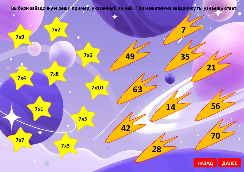 28 63 7 21 35 14 70 56 42 49 7х8 7х9 7х7 7х4 7х2 7х10 7х3 7х6 7х5 Выбери звёздочку и реши пример, указанный на ней. При нажатии на звёздочку ты узнаешь ответ. 7х1 ДАЛЕЕ НАЗАД