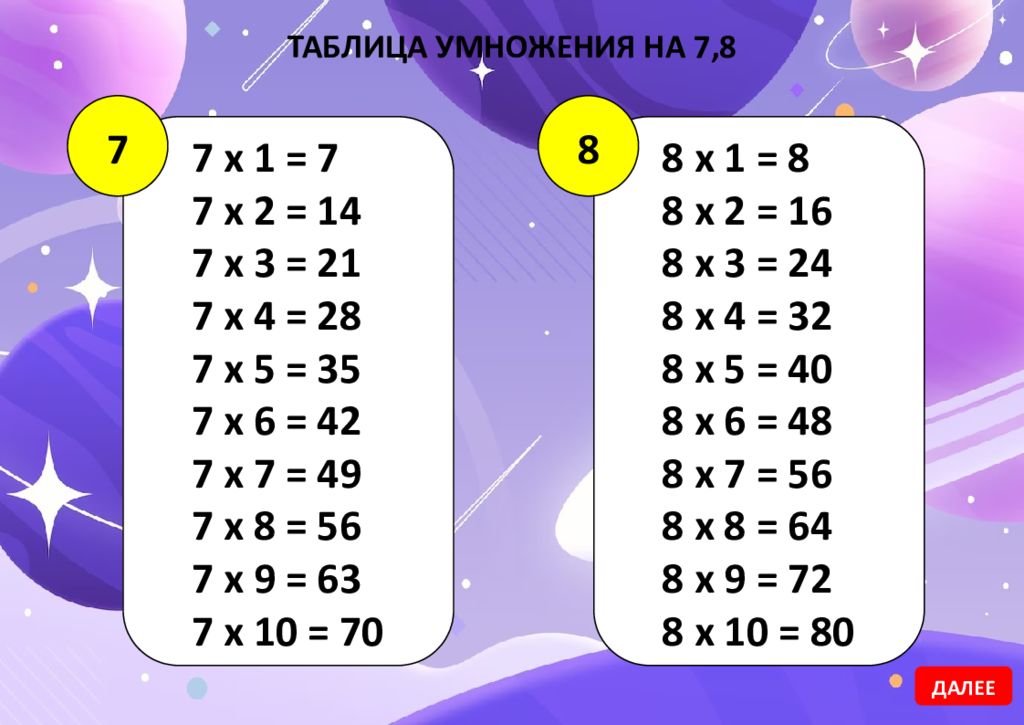 7 x 1 = 7 7 x 2 = 14 7 x 3 = 21 7 x 4 = 28 7 x 5 = 35 7 x 6 = 42 7 x 7 = 49 7 x 8 = 56 7 x 9 = 63 7 x 10 = 70 7 8 x 1 = 8 8 x 2 = 16 8 x 3 = 24 8 x 4 = 32 8 x 5 = 40 8 x 6 = 48 8 x 7 = 56 8 x 8 = 64 8 x 9 = 72 8 x 10 = 80 8 ТАБЛИЦА УМНОЖЕНИЯ НА 7,8 ДАЛЕЕ