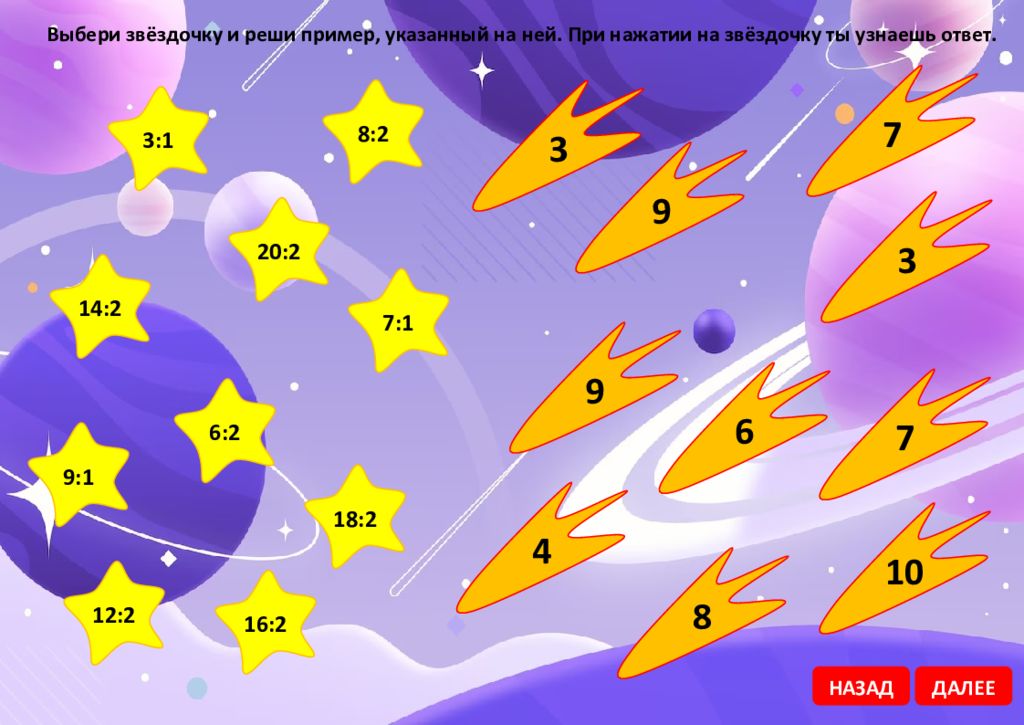 8 9 3 7 3 6 10 7 4 9 3:1 14:2 9:1 6:2 20:2 7:1 18:2 8:2 12: 2 Выбери звёздочку и реши пример, указанный на ней. При нажатии на звёздочку ты узнаешь ответ. 16:2 ДАЛЕЕ НАЗАД