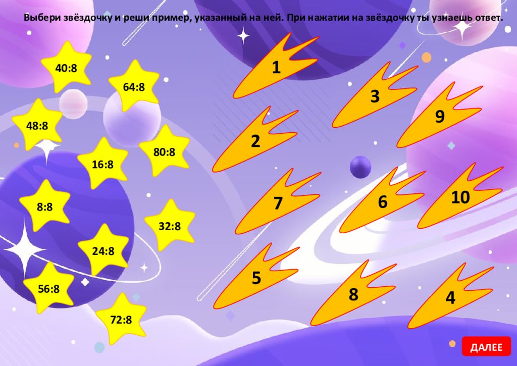10 1 9 8 6 5 7 4 2 3 40:8 48:8 8:8 16:8 64:8 80:8 32:8 72:8 24:8 Выбери звёздочку и реши пример, указанный на ней. При нажатии на звёздочку ты узнаешь ответ. 56:8 ДАЛЕЕ