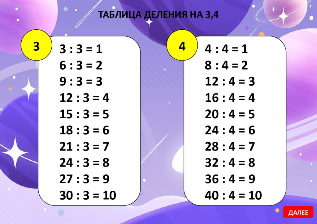 3 : 3 = 1 6 : 3 = 2 9 : 3 = 3 12 : 3 = 4 15 : 3 = 5 18 : 3 = 6 21 : 3 = 7 24 : 3 = 8 27 : 3 = 9 30 : 3 = 10 3 4 : 4 = 1 8 : 4 = 2 12 : 4 = 3 16 : 4 = 4 20 : 4 = 5 24 : 4 = 6 28 : 4 = 7 32 : 4 = 8 36 : 4 = 9 40 : 4 = 10 4 ТАБЛИЦА ДЕЛЕНИЯ НА 3,4 ДАЛЕЕ