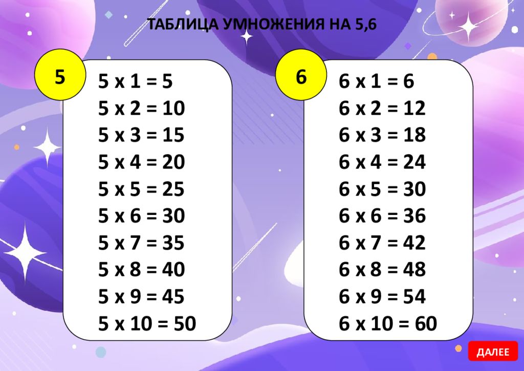 5 x 1 = 5 5 x 2 = 10 5 x 3 = 15 5 x 4 = 20 5 x 5 = 25 5 x 6 = 30 5 x 7 = 35 5 x 8 = 40 5 x 9 = 45 5 x 10 = 50 5 6 x 1 = 6 6 x 2 = 12 6 x 3 = 18 6 x 4 = 24 6 x 5 = 30 6 x 6 = 36 6 x 7 = 42 6 x 8 = 48 6 x 9 = 54 6 x 10 = 60 6 ТАБЛИЦА УМНОЖЕНИЯ НА 5,6 ДАЛЕЕ