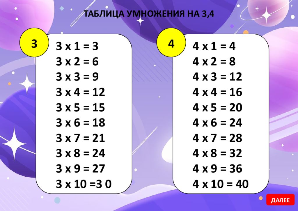 3 x 1 = 3 3 x 2 = 6 3 x 3 = 9 3 x 4 = 12 3 x 5 = 15 3 x 6 = 18 3 x 7 = 21 3 x 8 = 24 3 x 9 = 27 3 x 10 =3 0 3 4 x 1 = 4 4 x 2 = 8 4 x 3 = 12 4 x 4 = 16 4 x 5 = 20 4 x 6 = 24 4 x 7 = 28 4 x 8 = 32 4 x 9 = 36 4 x 10 = 40 4 ТАБЛИЦА УМНОЖЕНИЯ НА 3,4 ДАЛЕЕ