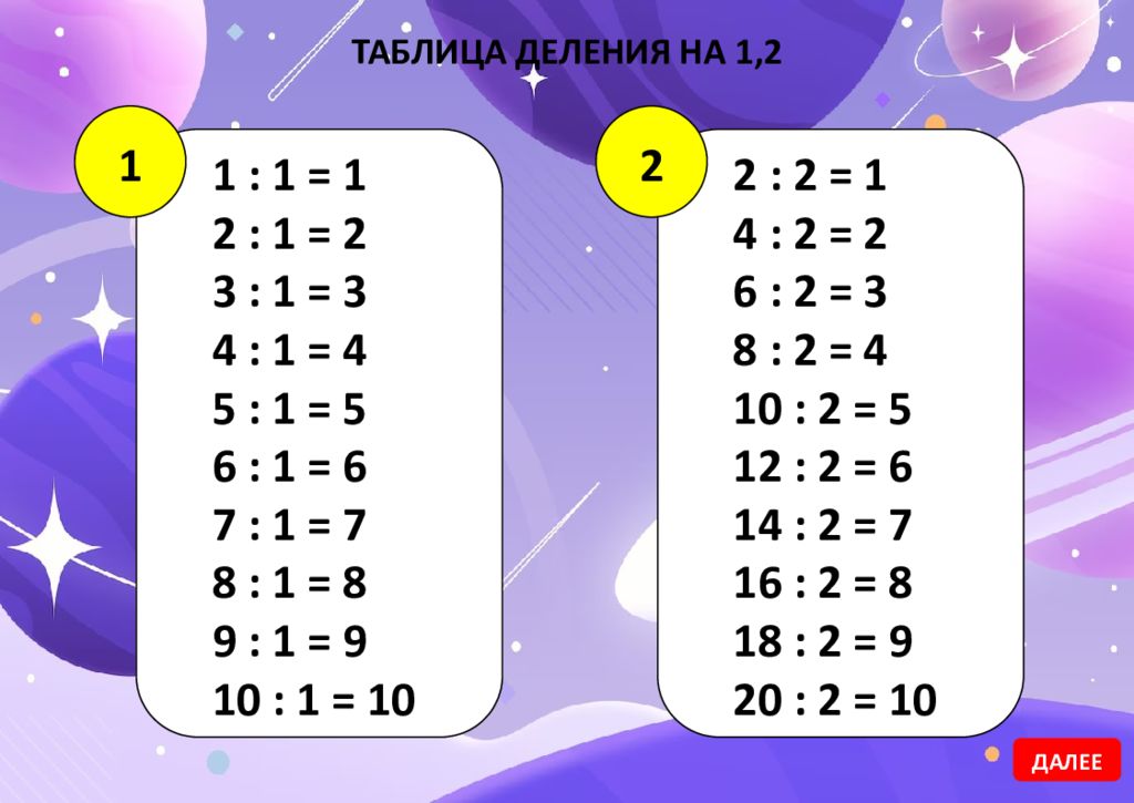 1 : 1 = 1 2 : 1 = 2 3 : 1 = 3 4 : 1 = 4 5 : 1 = 5 6 : 1 = 6 7 : 1 = 7 8 : 1 = 8 9 : 1 = 9 10 : 1 = 10 1 2 : 2 = 1 4 : 2 = 2 6 : 2 = 3 8 : 2 = 4 10 : 2 = 5 12 : 2 = 6 14 : 2 = 7 16 : 2 = 8 18 : 2 = 9 20 : 2 = 10 2 ТАБЛИЦА ДЕЛЕНИЯ НА 1,2 ДАЛЕЕ