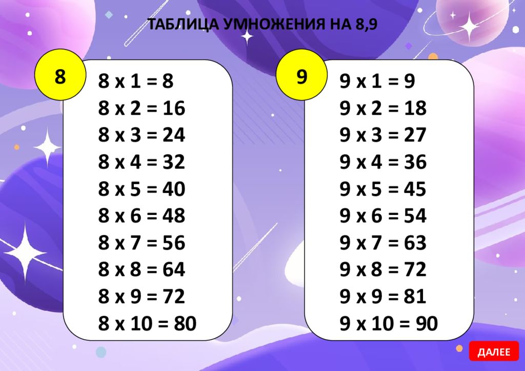 8 x 1 = 8 8 x 2 = 16 8 x 3 = 24 8 x 4 = 32 8 x 5 = 40 8 x 6 = 48 8 x 7 = 56 8 x 8 = 64 8 x 9 = 72 8 x 10 = 80 8 9 x 1 = 9 9 x 2 = 18 9 x 3 = 27 9 x 4 = 36 9 x 5 = 45 9 x 6 = 54 9 x 7 = 63 9 x 8 = 72 9 x 9 = 81 9 x 10 = 90 9 ТАБЛИЦА УМНОЖЕНИЯ НА 8,9 ДАЛЕЕ