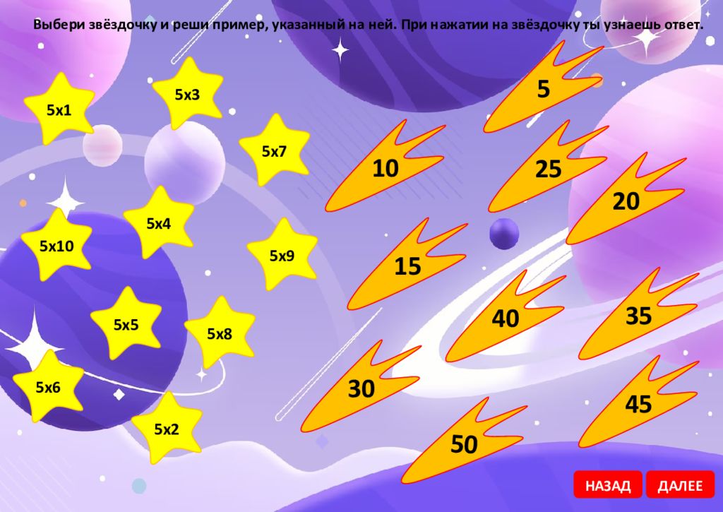 50 15 5 20 25 40 45 3 5 30 10 5х4 5х1 5 x 6 5х10 5х3 5 x 9 5 x 2 5 x 7 5 x 8 Выбери звёздочку и реши пример, указанный на ней. При нажатии на звёздочку ты узнаешь ответ. 5 x 5 ДАЛЕЕ НАЗАД