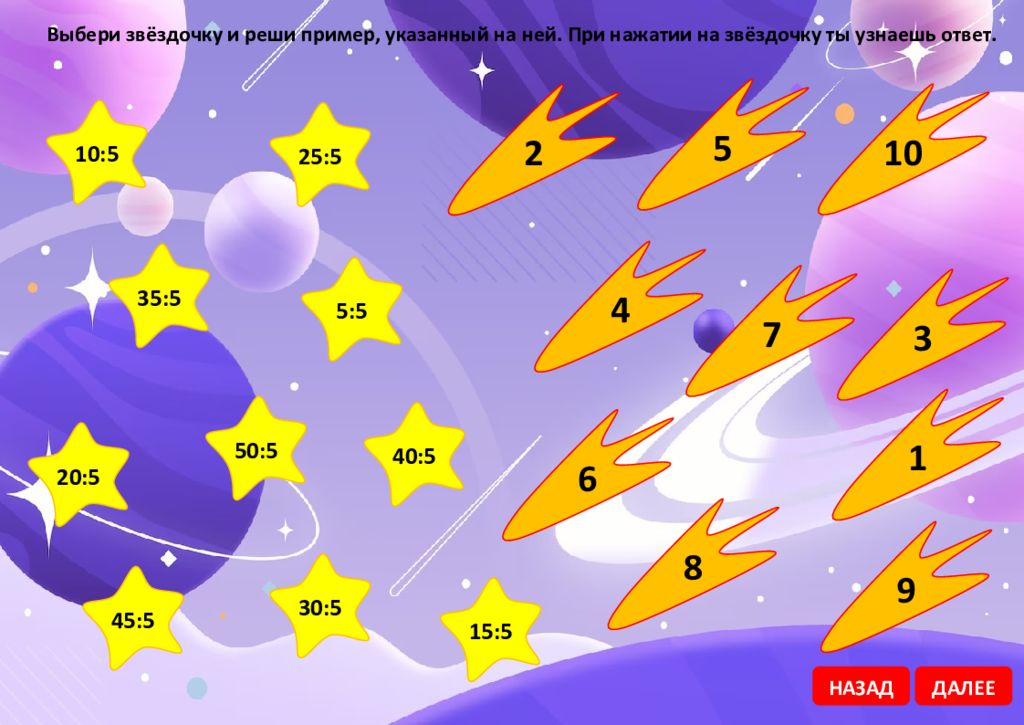 10 1 9 8 6 5 7 4 2 3 10:5 35:5 20:5 50:5 25:5 5:5 40:5 15:5 45:5 Выбери звёздочку и реши пример, указанный на ней. При нажатии на звёздочку ты узнаешь ответ. 30:5 ДАЛЕЕ НАЗАД