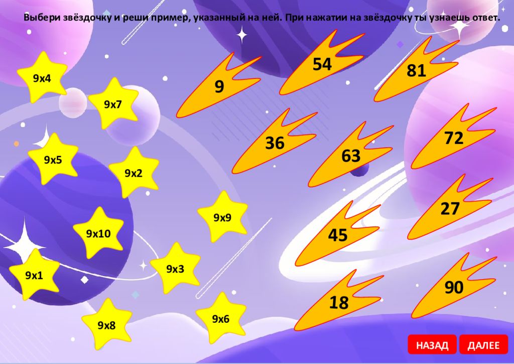 18 54 81 72 63 45 90 27 36 9 9х10 9х4 9х1 9х5 9х7 9х9 9х6 9х2 9х3 Выбери звёздочку и реши пример, указанный на ней. При нажатии на звёздочку ты узнаешь ответ. 9х8 ДАЛЕЕ НАЗАД
