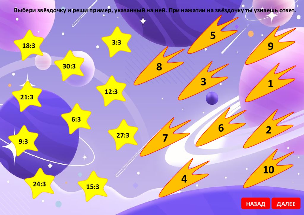 4 3 5 9 1 6 10 2 7 8 18:3 21:3 9:3 6:3 30:3 12:3 27:3 3:3 24:3 Выбери звёздочку и реши пример, указанный на ней. При нажатии на звёздочку ты узнаешь ответ. 15:3 ДАЛЕЕ НАЗАД