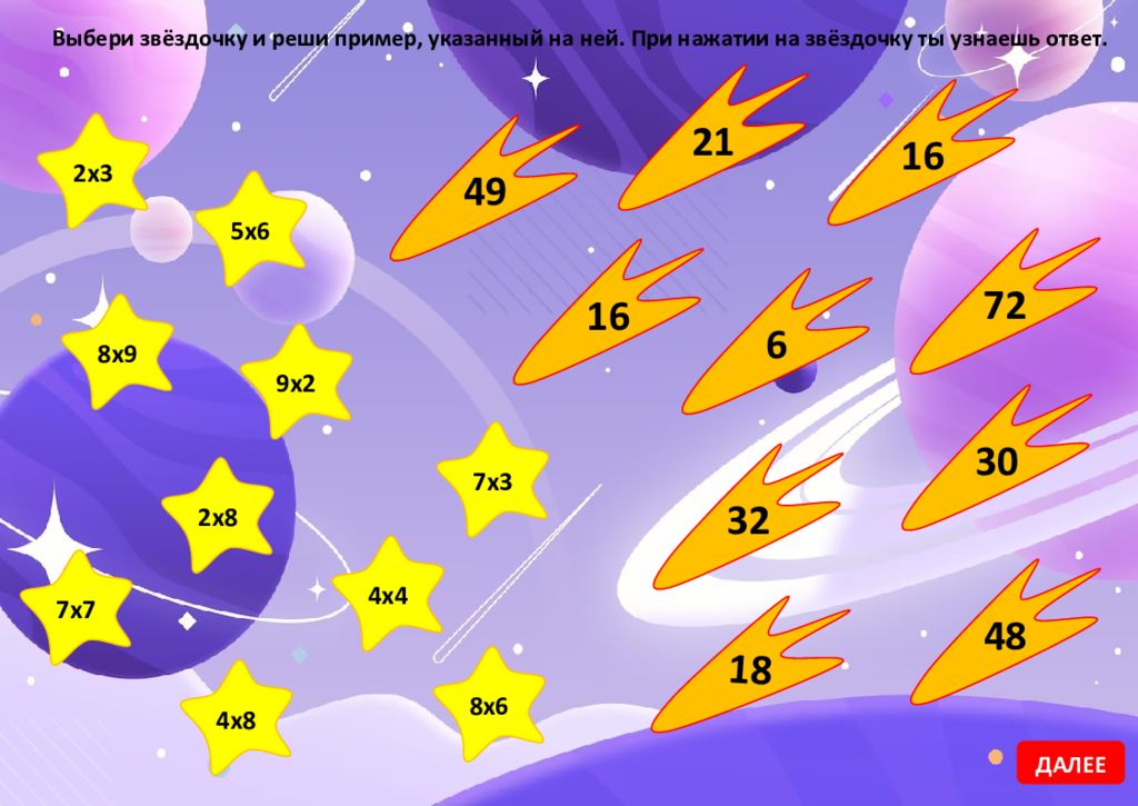 18 21 16 72 6 32 48 30 16 49 2х8 2х3 7х7 8х9 5х6 7х3 8х6 9х2 4х4 Выбери звёздочку и реши пример, указанный на ней. При нажатии на звёздочку ты узнаешь ответ. 4х8 ДАЛЕЕ