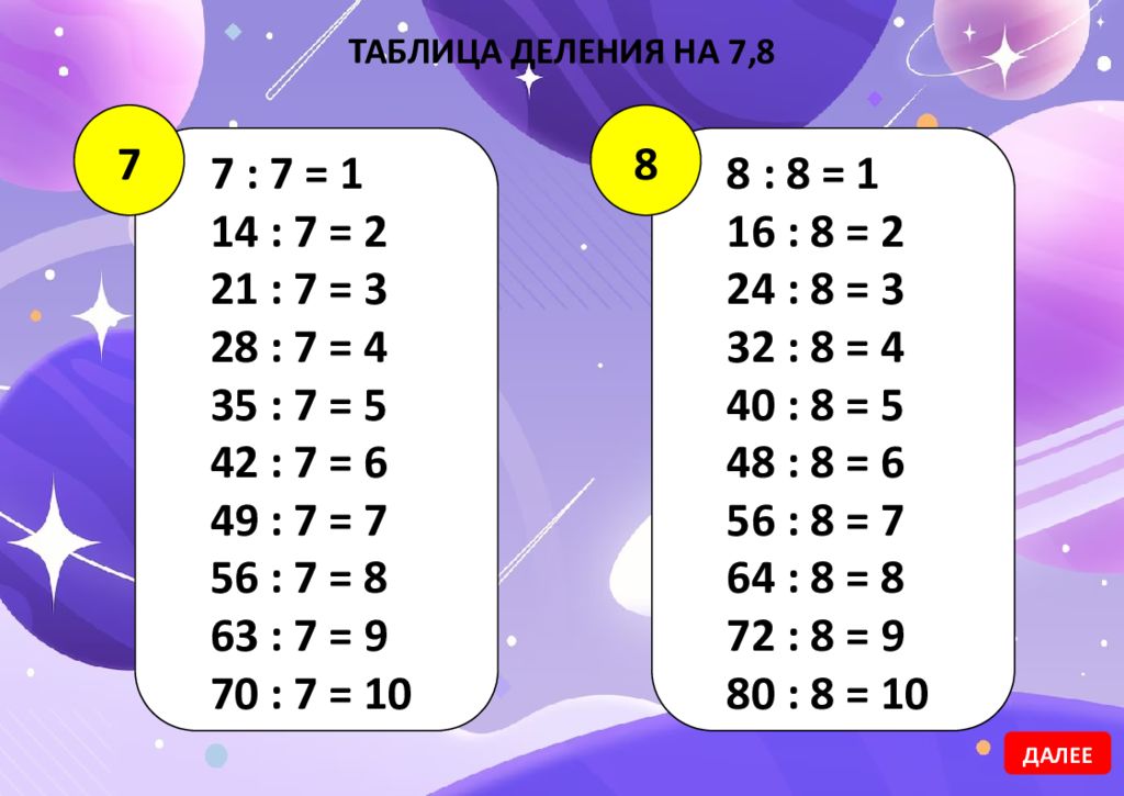 7 : 7 = 1 14 : 7 = 2 21 : 7 = 3 28 : 7 = 4 35 : 7 = 5 42 : 7 = 6 49 : 7 = 7 56 : 7 = 8 63 : 7 = 9 70 : 7 = 10 7 8 : 8 = 1 16 : 8 = 2 24 : 8 = 3 32 : 8 = 4 40 : 8 = 5 48 : 8 = 6 56 : 8 = 7 64 : 8 = 8 72 : 8 = 9 80 : 8 = 10 8 ТАБЛИЦА ДЕЛЕНИЯ НА 7,8 ДАЛЕЕ