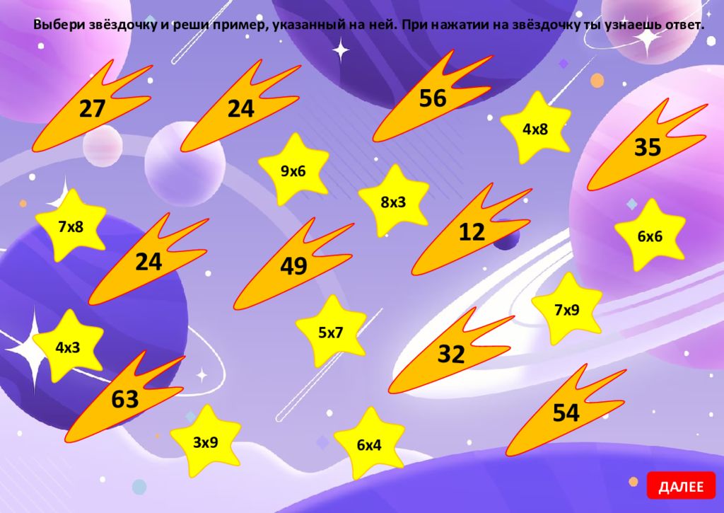 32 24 56 35 63 49 54 12 24 27 8х3 7х8 4х3 4х8 7х9 6х6 5х7 9х6 6х4 Выбери звёздочку и реши пример, указанный на ней. При нажатии на звёздочку ты узнаешь ответ. 3х9 ДАЛЕЕ