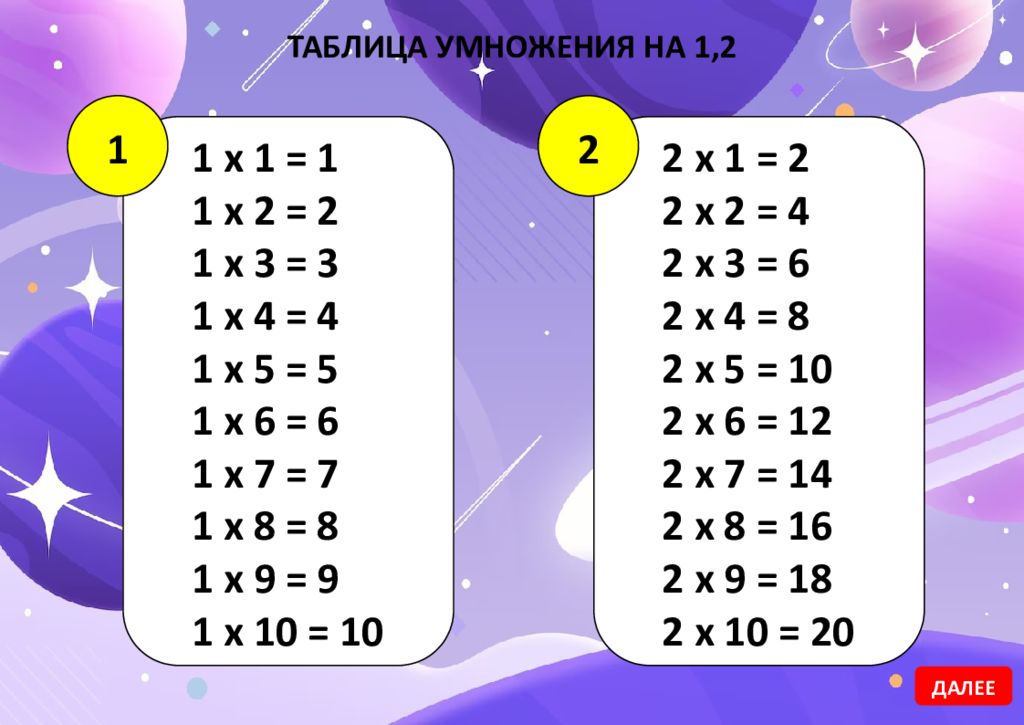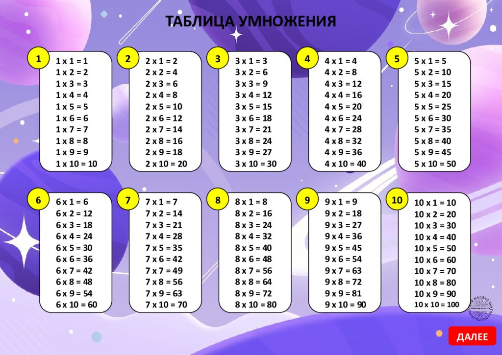 ТАБЛИЦА УМНОЖЕНИЯ 1 x 1 = 1 1 x 2 = 2 1 x 3 = 3 1 x 4 = 4 1 x 5 = 5 1 x 6 = 6 1 x 7 = 7 1 x 8 = 8 1 x 9 = 9 1 x 10 = 10 1 2 x 1 = 2 2 x 2 = 4 2 x 3 = 6 2 x 4 = 8 2 x 5 = 10 2 x 6 = 12 2 x 7 = 14 2 x 8 = 16 2 x 9 = 18 2 x 10 = 2 0 2 3 x 1 = 3 3 x 2 = 6 3 x 3 = 9 3 x 4 = 12 3 x 5 = 15 3 x 6 = 18 3 x 7 = 21 3 x 8 = 24 3 x 9 = 27 3 x 10 = 3 0 3 4 x 1 = 4 4 x 2 = 8 4 x 3 = 12 4 x 4 = 16 4 x 5 = 20 4 x 6 = 24 4 x 7 = 28 4 x 8 = 32 4 x 9 = 36 4 x 10 = 40 4 5 x 1 = 5 5 x 2 = 10 5 x 3 = 15 5 x 4 = 20 5 x 5 = 25 5 x 6 = 30 5 x 7 = 35 5 x 8 = 40 5 x 9 = 45 5 x 10 = 5 0 5 6 x 1 = 6 6 x 2 = 12 6 x 3 = 18 6 x 4 = 24 6 x 5 = 30 6 x 6 = 3 6 6 x 7 = 42 6 x 8 = 4 8 6 x 9 = 54 6 x 10 = 6 0 6 7 x 1 = 7 7 x 2 = 14 7 x 3 = 21 7 x 4 = 28 7 x 5 = 35 7 x 6 = 42 7 x 7 = 49 7 x 8 = 56 7 x 9 = 63 7 x 10 = 7 0 7 8 x 1 = 8 8 x 2 = 16 8 x 3 = 24 8 x 4 = 32 8 x 5 = 40 8 x 6 = 48 8 x 7 = 56 8 x 8 = 64 8 x 9 = 72 8 x 10 = 8 0 8 9 x 1 = 9 9 x 2 = 18 9 x 3 = 27 9 x 4 = 36 9 x 5 = 45 9 x 6 = 54 9 x 7 = 63 9 x 8 = 72 9 x 9 = 81 9 x 10 = 90 9 10 x 1 = 10 10 x 2 = 20 10 x 3 = 30 10 x 4 = 40 10 x 5 = 50 10 x 6 = 60 10 x 7 = 70 10 x 8 = 80 10 x 9 = 90 10 x 10 = 100 10 ДАЛЕЕ