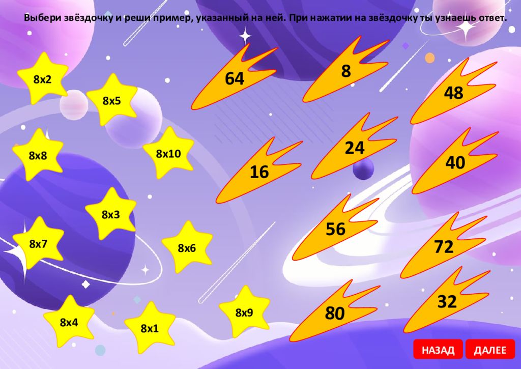 80 16 8 40 48 24 32 72 56 64 8х3 8х2 8х4 8х8 8х5 8х10 8х1 8х9 8х6 Выбери звёздочку и реши пример, указанный на ней. При нажатии на звёздочку ты узнаешь ответ. 8х7 ДАЛЕЕ НАЗАД