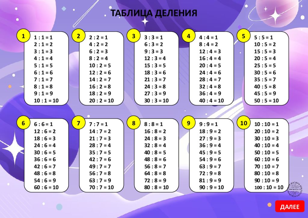 1 : 1 = 1 2 : 1 = 2 3 : 1 = 3 4 : 1 = 4 5 : 1 = 5 6 : 1 = 6 7 : 1 = 7 8 : 1 = 8 9 : 1 = 9 10 : 1 = 10 1 2 : 2 = 1 4 : 2 = 2 6 : 2 = 3 8 : 2 = 4 10 : 2 = 5 12 : 2 = 6 14 : 2 = 7 16 : 2 = 8 18 : 2 = 9 20 : 2 = 1 0 2 3 : 3 = 1 6 : 3 = 2 9 : 3 = 3 12 : 3 = 4 15 : 3 = 5 18 : 3 = 6 21 : 3 = 7 24 : 3 = 8 27 : 3 = 9 3 0 : 3 = 10 3 4 : 4 = 1 8 : 4 = 2 12 : 4 = 3 16 : 4 = 4 20 : 4 = 5 24 : 4 = 6 28 : 4 = 7 32 : 4 = 8 36 : 4 = 9 40 : 4 = 10 4 5 : 5 = 1 10 : 5 = 2 15 : 5 = 3 20 : 5 = 4 25 : 5 = 5 30 : 5 = 6 35 : 5 = 7 40 : 5 = 8 45 : 5 = 9 5 0 : 5 = 10 5 6 : 6 = 1 12 : 6 = 2 18 : 6 = 3 24 : 6 = 4 30 : 6 = 5 3 6 : 6 = 6 42 : 6 = 7 4 8 : 6 = 8 54 : 6 = 9 6 0 : 6 = 10 6 7 : 7 = 1 14 : 7 = 2 21 : 7 = 3 28 : 7 = 4 35 : 7 = 5 42 : 7 = 6 49 : 7 = 7 56 : 7 = 8 63 : 7 = 9 7 0 : 7 = 10 7 8 : 8 = 1 16 : 8 = 2 24 : 8 = 3 32 : 8 = 4 40 : 8 = 5 48 : 8 = 6 56 : 8 = 7 64 : 8 = 8 72 : 8 = 9 8 0 : 8 = 10 8 9 : 9 = 1 18 : 9 = 2 27 : 9 = 3 36 : 9 = 4 45 : 9 = 5 54 : 9 = 6 63 : 9 = 7 72 : 9 = 8 81 : 9 = 9 90 : 9 = 10 9 10 : 10 = 1 20 : 10 = 2 30 : 10 = 3 40 : 10 = 4 50 : 10 = 5 60 : 10 = 6 70 : 10 = 7 80 : 10 = 8 90 : 10 = 9 100 : 10 = 10 10 ТАБЛИЦА ДЕЛЕНИЯ ДАЛЕЕ
