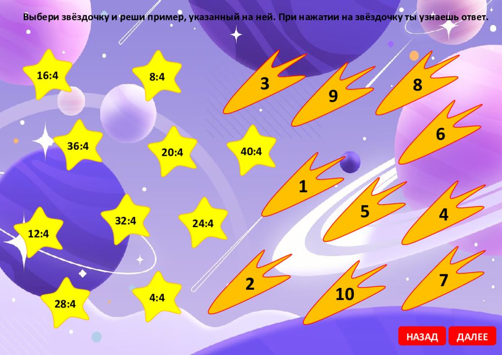 10 1 9 8 6 5 7 4 2 3 16:4 36:4 12:4 32:4 8:4 20:4 24:4 40:4 28:4 Выбери звёздочку и реши пример, указанный на ней. При нажатии на звёздочку ты узнаешь ответ. 4:4 ДАЛЕЕ НАЗАД