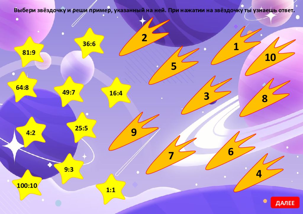 10 3 9 8 6 1 2 4 7 5 81:9 64:8 4:2 1:1 36:6 49:7 16:4 9:3 25:5 Выбери звёздочку и реши пример, указанный на ней. При нажатии на звёздочку ты узнаешь ответ. 100:10 ДАЛЕЕ