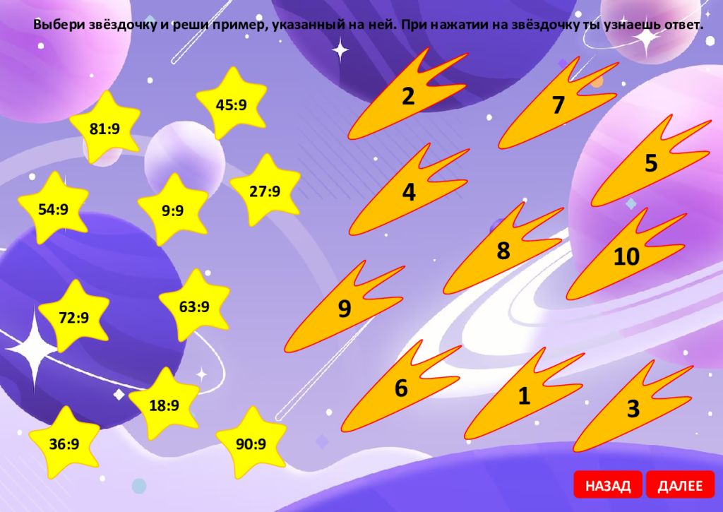 10 1 9 8 6 5 7 4 2 3 81:9 54:9 72:9 9:9 45:9 27:9 90:9 18:9 63:9 Выбери звёздочку и реши пример, указанный на ней. При нажатии на звёздочку ты узнаешь ответ. 36:9 ДАЛЕЕ НАЗАД