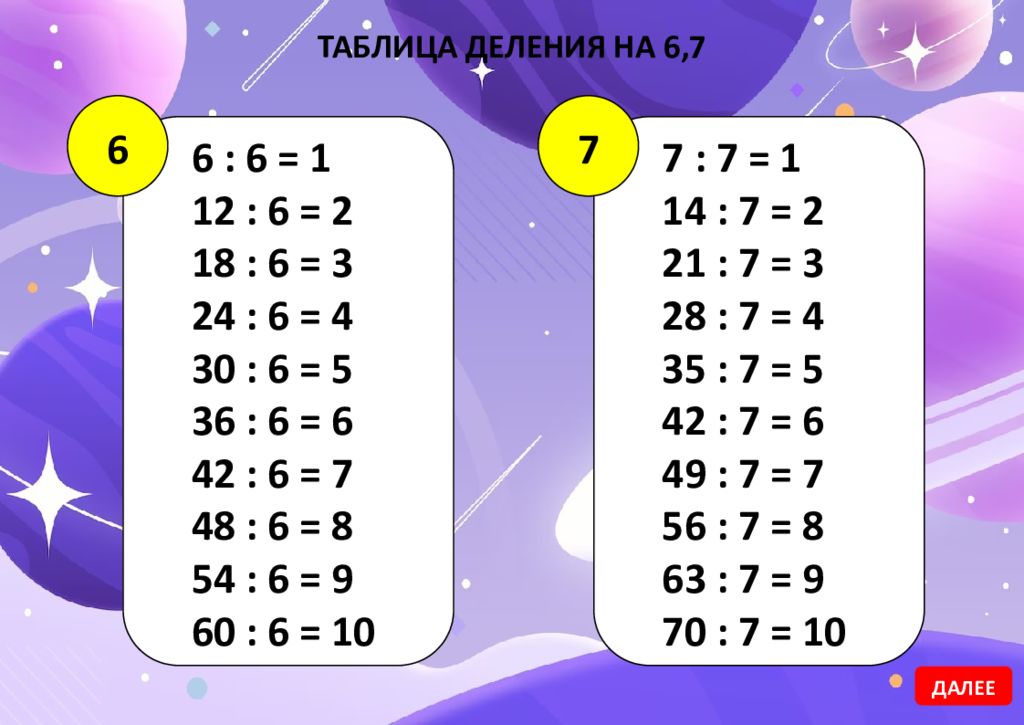 6 : 6 = 1 12 : 6 = 2 18 : 6 = 3 24 : 6 = 4 30 : 6 = 5 36 : 6 = 6 42 : 6 = 7 48 : 6 = 8 54 : 6 = 9 60 : 6 = 10 6 7 : 7 = 1 14 : 7 = 2 21 : 7 = 3 28 : 7 = 4 35 : 7 = 5 42 : 7 = 6 49 : 7 = 7 56 : 7 = 8 63 : 7 = 9 70 : 7 = 10 7 ТАБЛИЦА ДЕЛЕНИЯ НА 6,7 ДАЛЕЕ