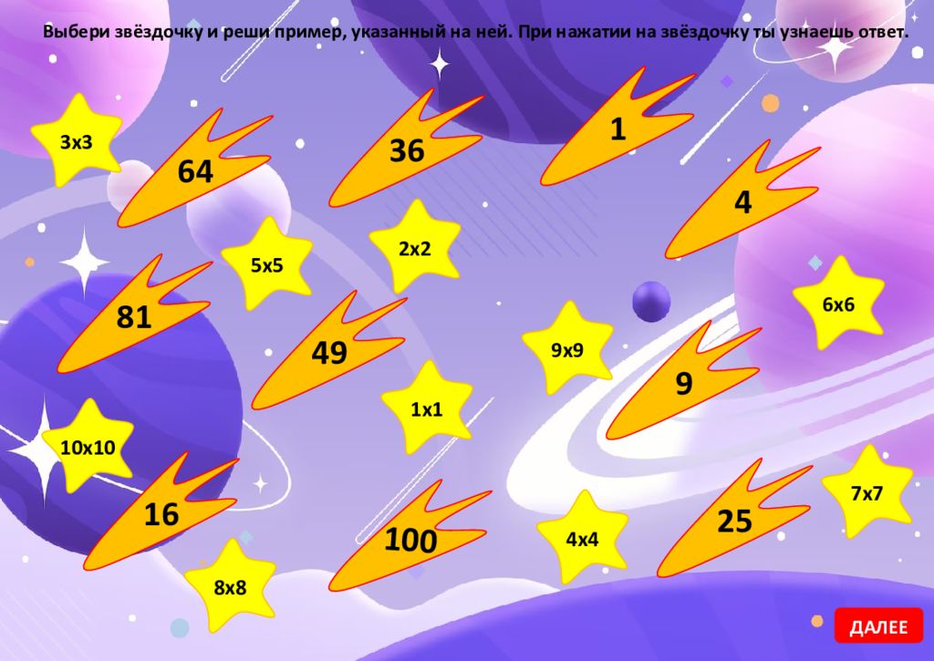 100 36 1 4 16 49 25 9 81 64 7х7 3х3 10х10 5х5 1х1 6х6 9х9 2х2 4х4 Выбери звёздочку и реши пример, указанный на ней. При нажатии на звёздочку ты узнаешь ответ. 8х8 ДАЛЕЕ