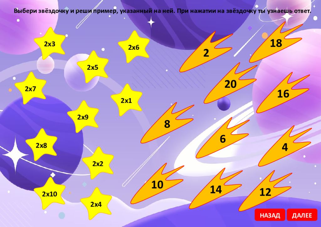 Выбери звёздочку и реши пример, указанный на ней. При нажатии на звёздочку ты узнаешь ответ. 18 2 20 8 16 6 4 10 14 12 2x3 2x7 2x5 2x9 2x8 2x1 2x2 2x6 2x10 2 x4 ДАЛЕЕ НАЗАД