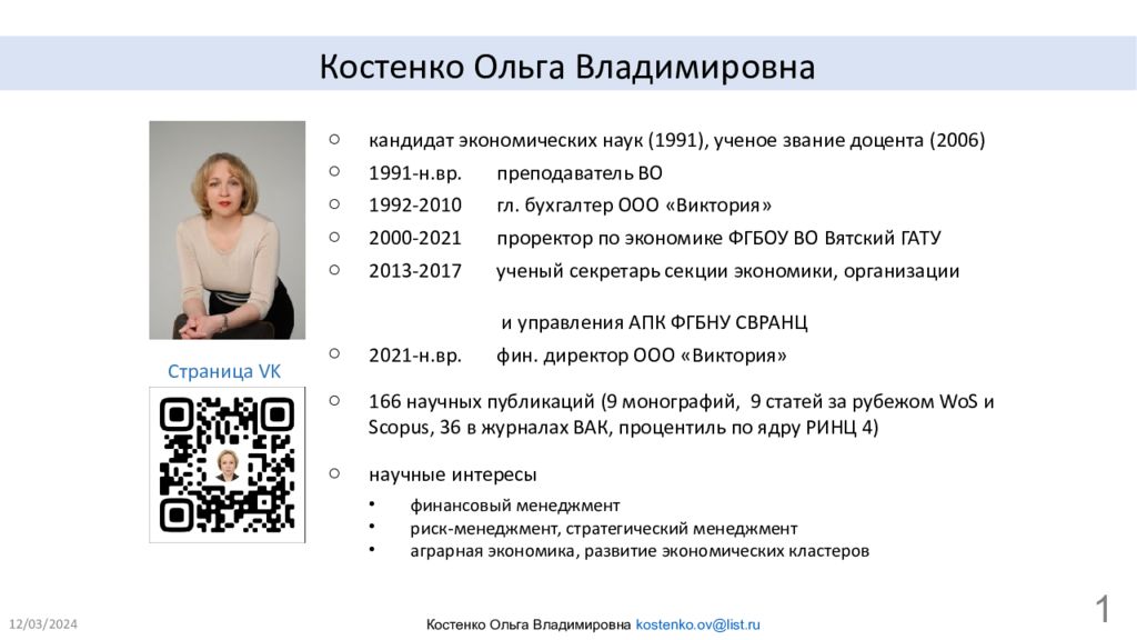 Костенко Ольга Владимировна кандидат экономических наук (1991), ученое звание доцента (2006) 1991-н.вр. преподаватель ВО 1992-2010 гл. бухгалтер ООО «Виктория» 2000-2021 проректор по экономике ФГБОУ ВО Вятский ГАТУ 2013-2017 ученый секретарь секции экономики, организации и управления АПК ФГБНУ СВРАНЦ 2021-н.вр. фин. директор ООО «Виктория» 166 научных публикаций (9 монографий, 9 статей за рубежом WoS и Scopus, 36 в журналах ВАК, процентиль по ядру РИНЦ 4) н аучные интересы финансовый менеджмент риск-менеджмент, стратегический менеджмент аграрная экономика, развитие экономических кластеров Костенко Ольга Владимировна kostenko.ov@list.ru 1 03.12.2024 Страница VK
