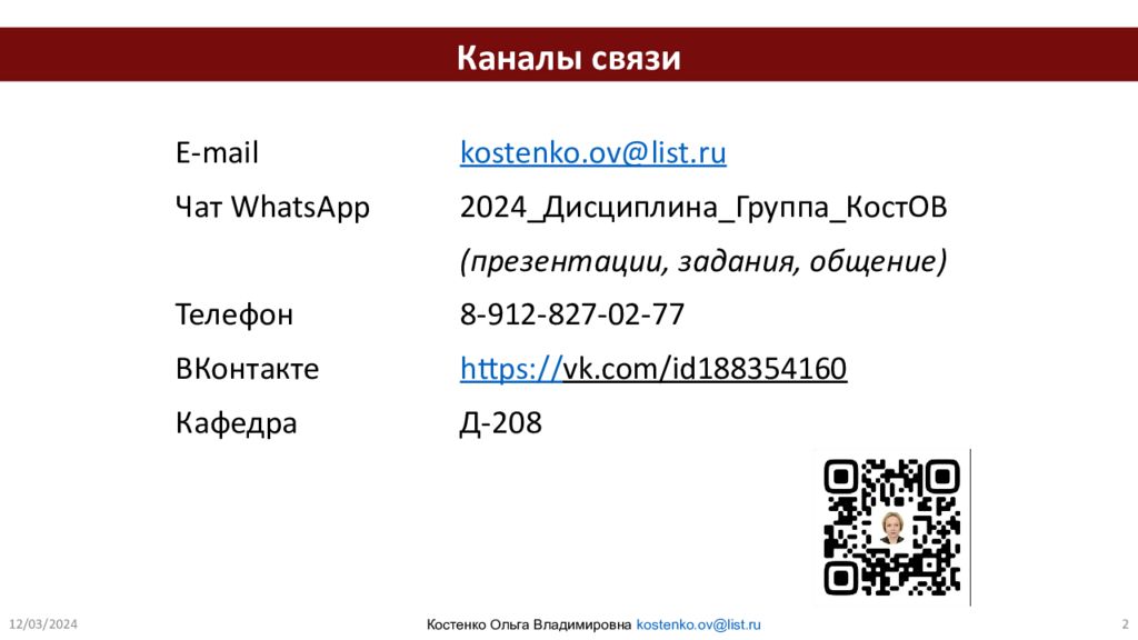Каналы связи 03.12.2024 2 E-mail kostenko.ov@list.ru Чат WhatsApp 2024_Дисциплина_Группа_КостОВ (презентации, задания, общение) Телефон 8-912-827-02-77 ВКонтакте https:// vk.com/id188354160 Кафедра Д-208 Костенко Ольга Владимировна kostenko.ov@list.ru