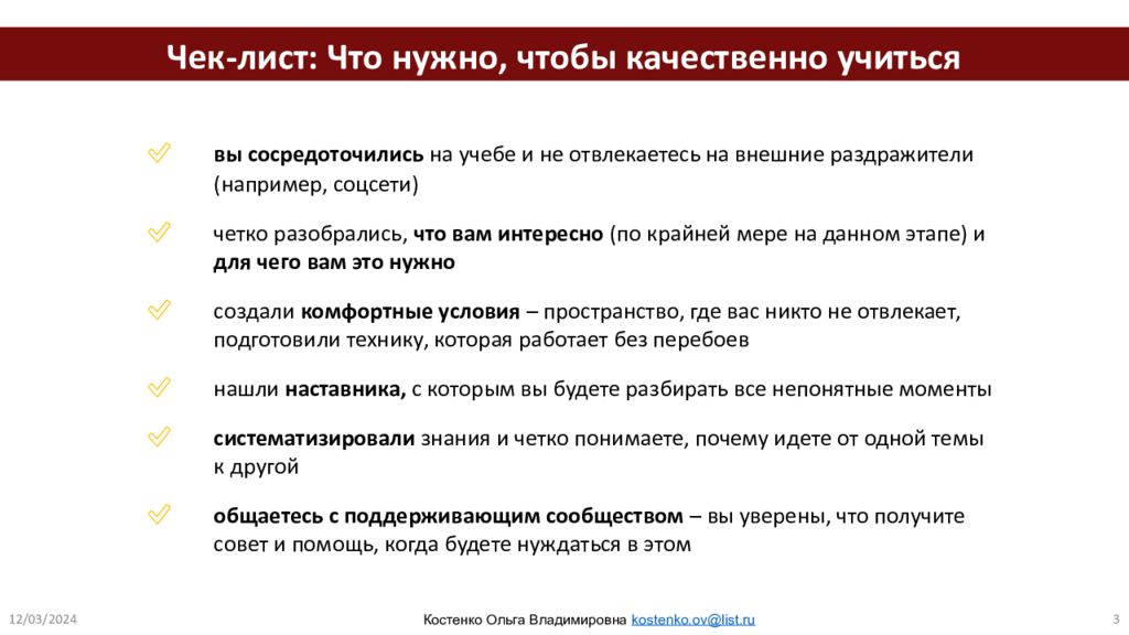 Чек-лист: Что нужно, чтобы качественно учиться 03.12.2024 3 ✅ вы сосредоточились на учебе и не отвлекаетесь на внешние раздражители (например, соцсети ) ✅ четко разобрались, что вам интересно (по крайней мере на данном этапе) и для чего вам это нужно ✅ создали комфортные условия – пространство, где вас никто не отвлекает, подготовили технику, которая работает без перебоев ✅ нашли наставника, с которым вы будете разбирать все непонятные моменты ✅ систематизировали знания и четко понимаете, почему идете от одной темы к другой ✅ общаетесь с поддерживающим сообществом – вы уверены, что получите совет и помощь, когда будете нуждаться в этом Костенко Ольга Владимировна kostenko.ov@list.ru