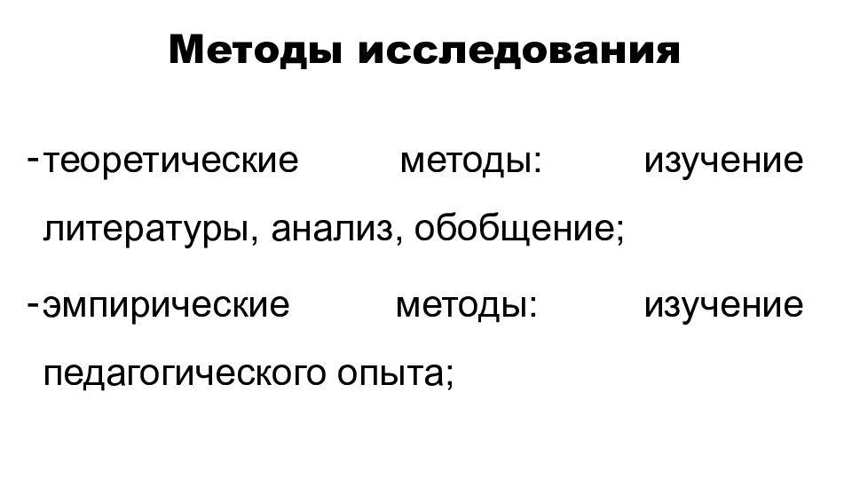 теоретические методы: изучение литературы, анализ, обобщение; эмпирические методы: изучение педагогического опыта; Методы исследования