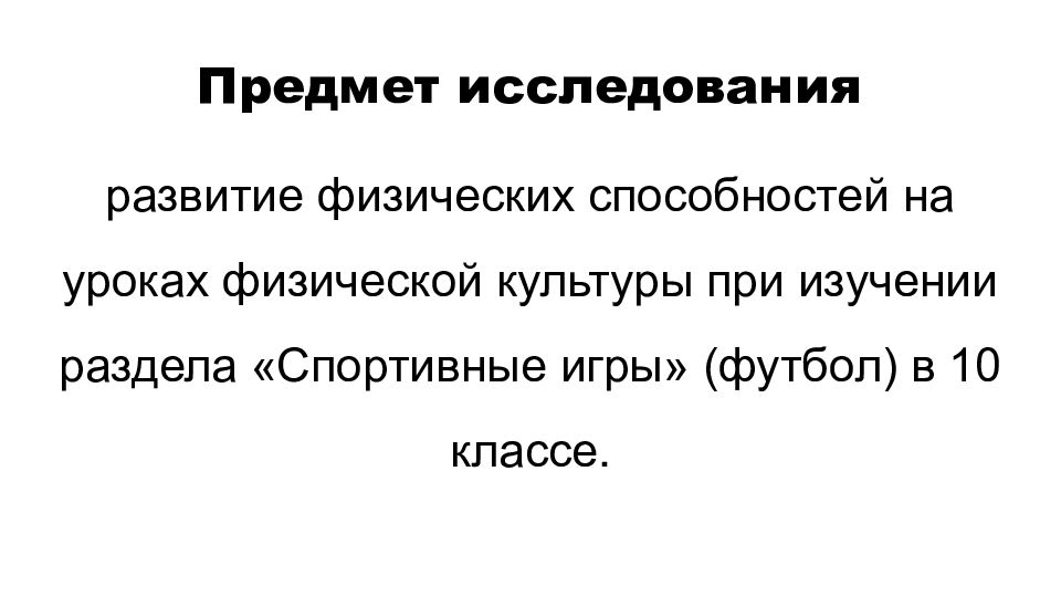 развитие физических способностей на уроках физической культуры при изучении раздела «Спортивные игры» (футбол) в 10 классе. Предмет исследования