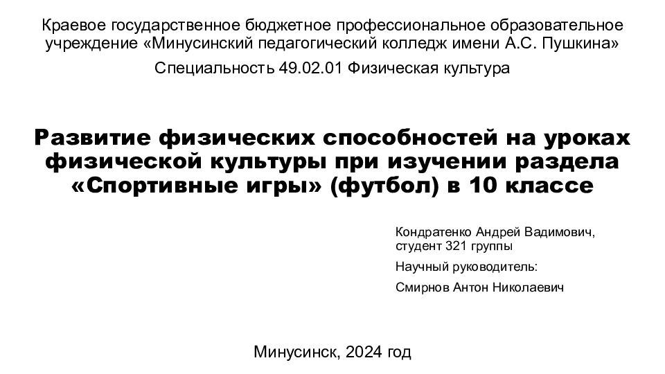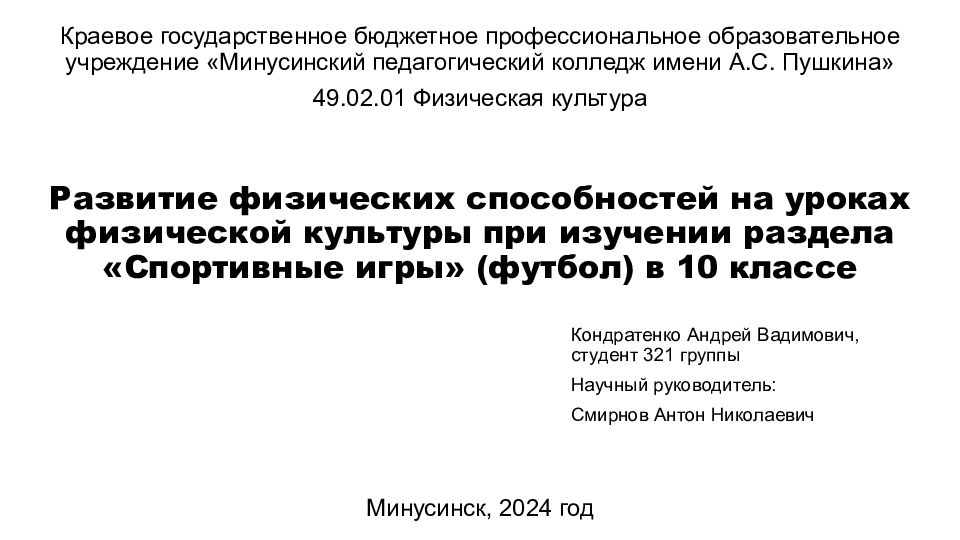 Краевое государственное бюджетное профессиональное образовательное учреждение «Минусинский педагогический колледж имени А.С. Пушкина» 49.02.01 Физическая культура Развитие физических способностей на уроках физической культуры при изучении раздела «Спортивные игры» (футбол) в 10 классе Кондратенко Андрей Вадимович, студент 321 группы Научный руководитель: Смирнов Антон Николаевич Минусинск, 2024 год
