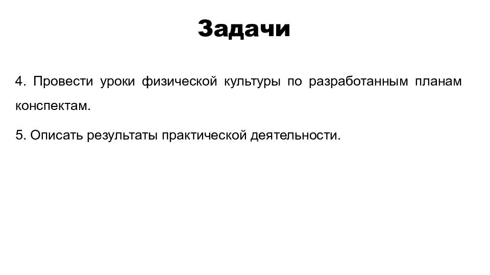 4. Провести уроки физической культуры по разработанным планам конспектам. 5. Описать результаты практической деятельности. Задачи