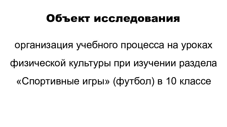организация учебного процесса на уроках физической культуры при изучении раздела «Спортивные игры» (футбол) в 10 классе Объект исследования