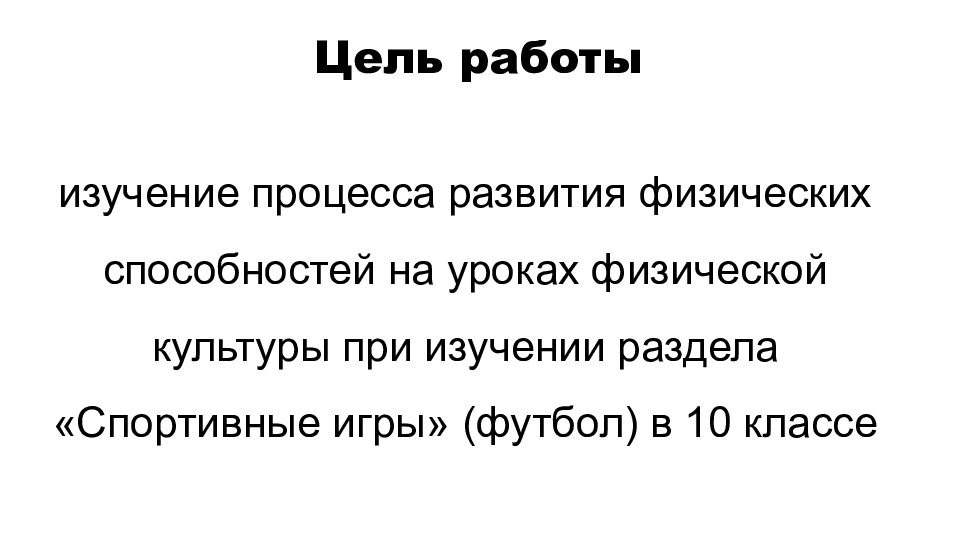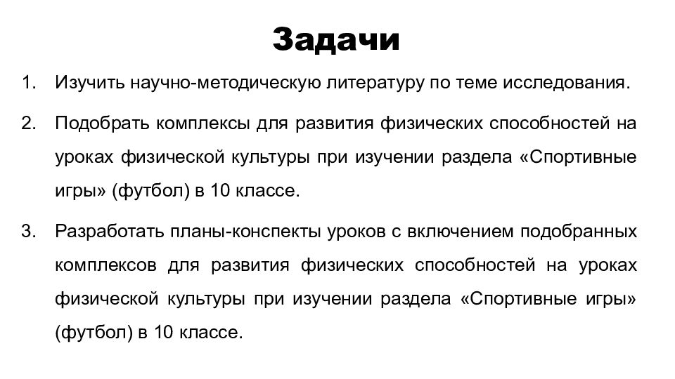 Изучить научно-методическую литературу по теме исследования. Подобрать комплексы для развития физических способностей на уроках физической культуры при изучении раздела «Спортивные игры» (футбол) в 10 классе. Разработать планы-конспекты уроков с включением подобранных комплексов для развития физических способностей на уроках физической культуры при изучении раздела «Спортивные игры» (футбол) в 10 классе. Задачи