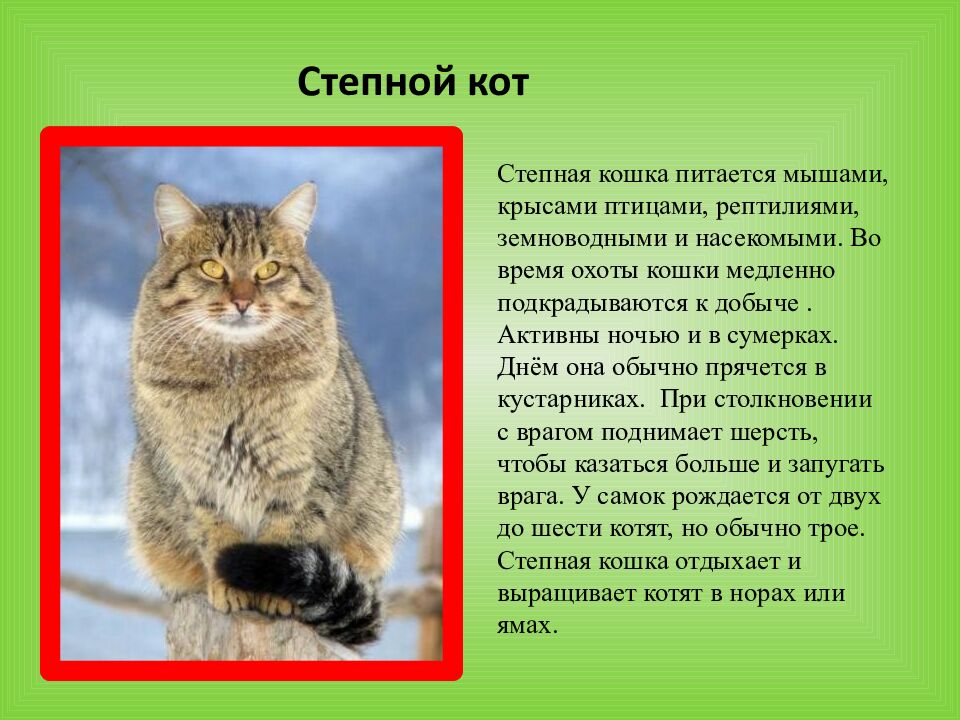 Степная кошка питается мышами, крысами птицами, рептилиями, земноводными и насекомыми. Во время охоты кошки медленно подкрадываются к добыче. А ктивны ночью и в сумерках. Днём она обычно прячется в кустарниках. При столкновении с врагом поднимает шерсть, чтобы казаться больше и запугать врага. У самок рождается от двух до шести котят, но обычно трое. Степная кошка отдыхает и выращивает котят в норах или ямах.