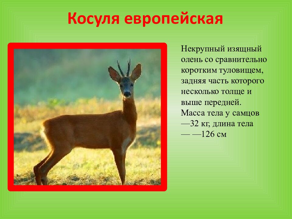 Некрупный изящный олень со сравнительно коротким туловищем, задняя часть которого несколько толще и выше передней. Масса тела у самцов —32 кг, длина тела — —126 см