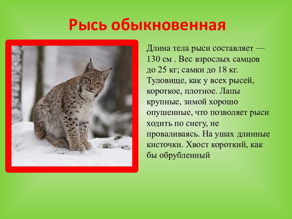 Длина тела рыси составляет —130 см. Вес взрослых самцов до 25 кг; самки до 18 кг. Туловище, как у всех рысей, короткое, плотное. Лапы крупные, зимой хорошо опушенные, что позволяет рыси ходить по снегу, не проваливаясь. На ушах длинные кисточки. Хвост короткий, как бы обрубленный.