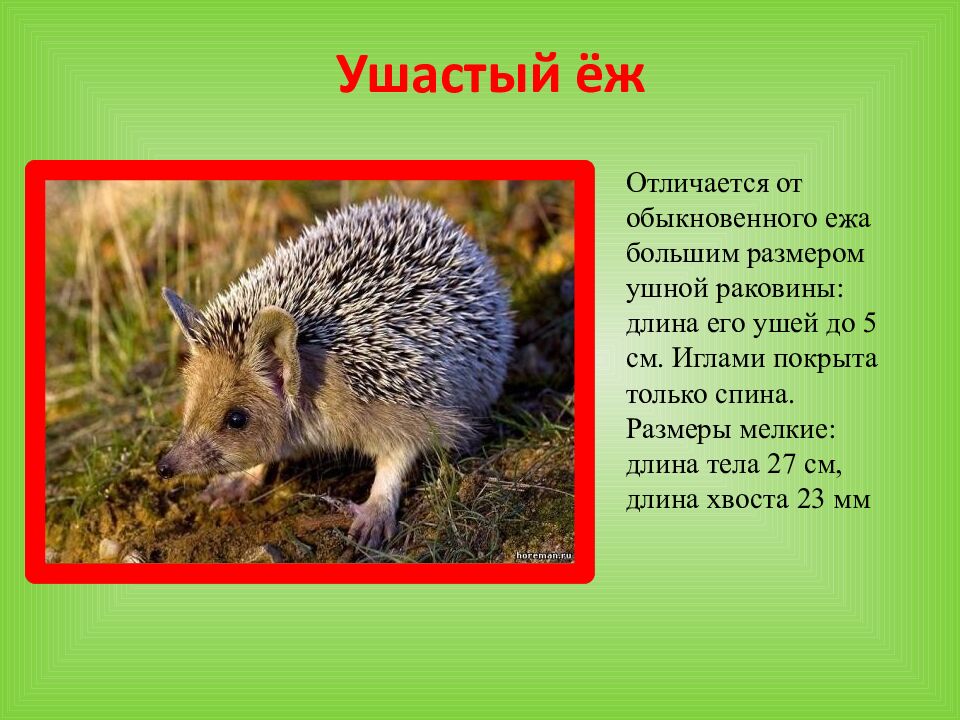 Отличается от обыкновенного ежа большим размером ушной раковины: длина его ушей до 5 см. Иглами покрыта только спина. Размеры мелкие: длина тела 27 см, длина хвоста 23 мм