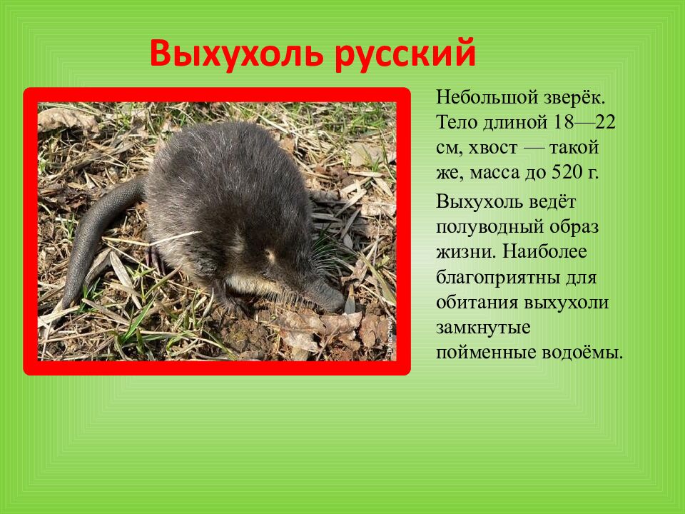 Небольшой зверёк. Тело длиной 18—22 см, хвост — такой же, масса до 520 г. Выхухоль ведёт полуводный образ жизни. Наиболее благоприятны для обитания выхухоли замкнутые пойменные водоёмы.